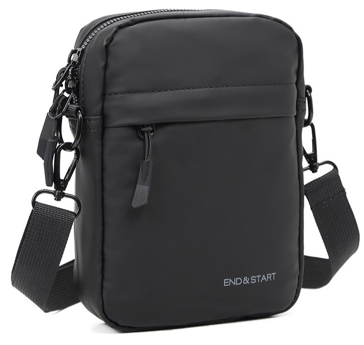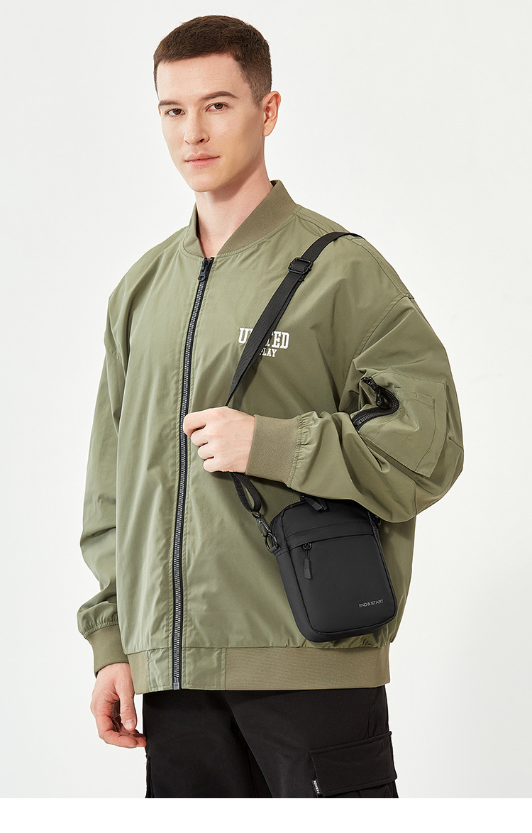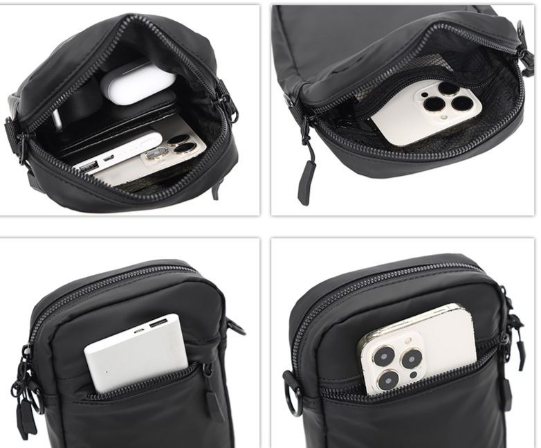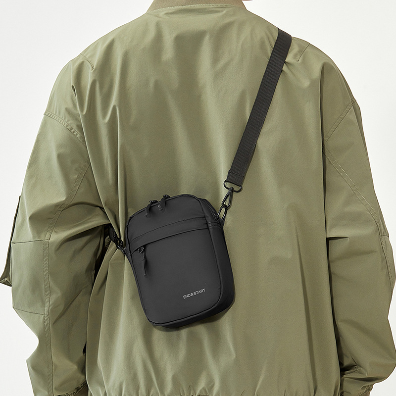 黒の本体に調節可能なストラップを備え、斜め掛けスタイルで快適に使用可能です。